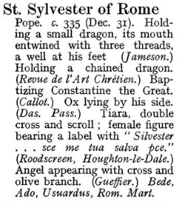 A chapel dedicated to Saint Sylvester in the church of Santi Quattro Coronati in Rome preserves a vividly colored fresco cycle dating to the thirteenth century. The cycle depicts stories that were fabricated several centuries after his lifetime (information – photos, scroll down past photographs from San Clemente to see the photographs from the chapel of Saint Sylvester – video).