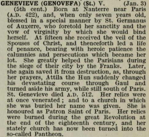 The church of the monastery built at her tomb was built anew in the 18th century, just in time to be deconsecrated and to became a monument to secular France, the Pantheon. It still preserves a fresco of her apotheosis. Today her shrine is in the church of St-Etienne-du-Mont.