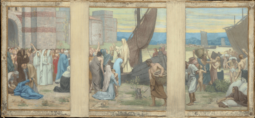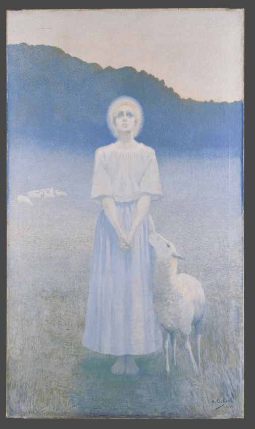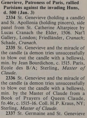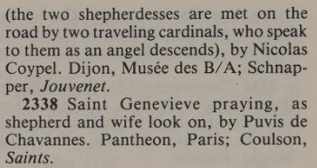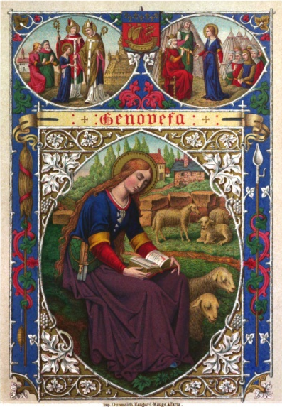 Paintings at the Musée d’Orsay – sketches by Jean-Paul Laurens of her deathbed, her death, and her funeral & La Foi, l’Espérance, la Charité veillant sur sainte Geneviève au berceau by Pierre Puvis de Chavannes