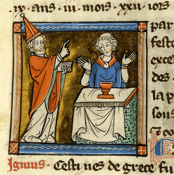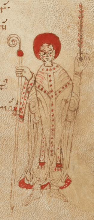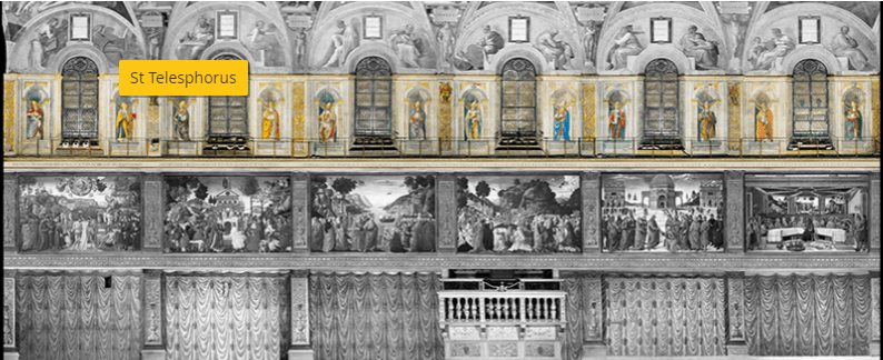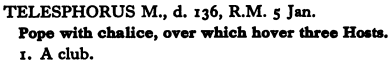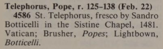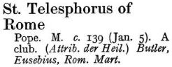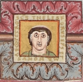 – El Escorial, Real Biblioteca, Cod. Vitrinas 17, folio 4v: SANCTVS THELESFORVS EPISCOPVS ET MARTYR NONVS A SANCTO PETRO (detail above)