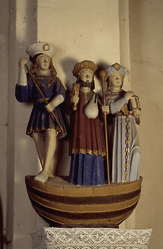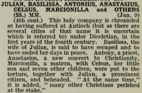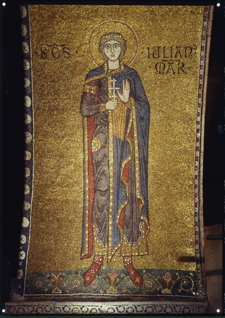 – San Marco in Venice: Nave, west arm, north aisle, pier 2 (zone 2): (13c.) Julian, name inscribed S(AN)C(TU)S IULIAN(US) MAR(TYR). wearing cap, and Basilissa, name inscribed S(AN)C(T)A BASILISSA EIUX (EIUS UXOR), crowned, both of Antioch, each holding cross with double traverse, (13c.) (above)