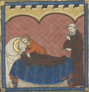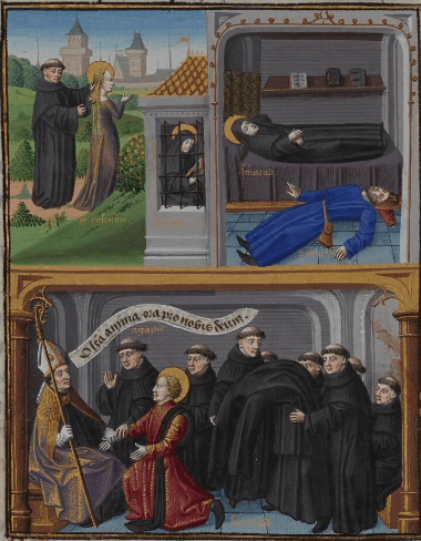 – France, Paris. Bibliothèque nationale de France, Département des manuscrits, Français 51: f.202v – Sainte Euphrosyne d’Alexandrie rasée, Sainte Euphrosyne d’Alexandrie en cellule, & Mort de sainte Euphrosyne d’Alexandrie, Sainte Euphrosyne d’Alexandrie déguisée entrant au monastère, Sainte Euphrosyne d’Alexandrie prenant l’habit