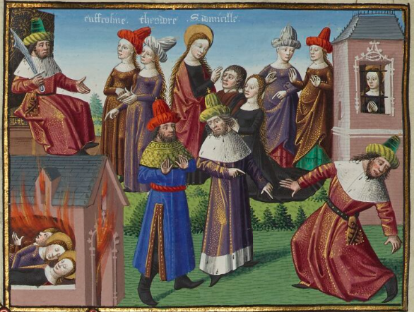 – France, Paris. Bibliothèque nationale de France, Département des manuscrits, Français 50: f.370v – Sainte Euphrosyne et Théodora devant Aurelianus