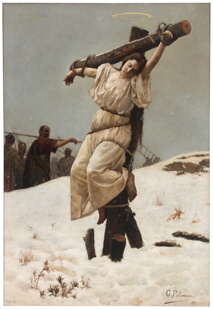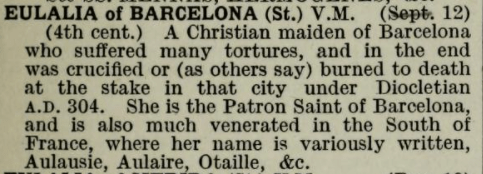 To distinguish Saint Eulalia of Barcelona from Saint Eulalia of Merida, look for works associated with or in Barcelona and images of the saint being crucified or with the cross of her martyrdom.