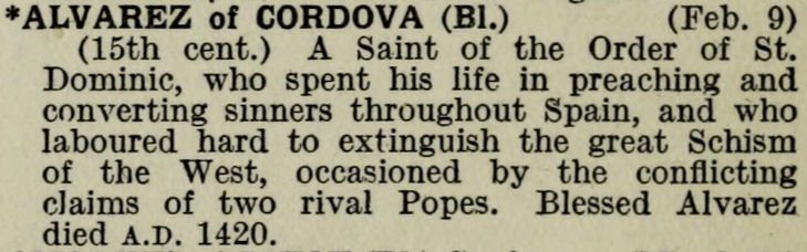 19 February – Blessed Álvaro of Córdoba Posted bymagistrahildegard19 February 202219 February 2025Posted inSanctoraleTags:15C, Dominican, Spain Compendio histórico The Book of Saints Modern Hagiography Short Lives of the Dominican Saints Stars in Saint Dominic’s Crown Share this: Click to share on X (Opens in new window) X Click to share on Facebook (Opens in new window) Facebook Like Loading... Related