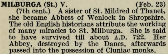 Priory Of St Milburga/Wenlock Priory, about, nice online presentation from English Heritage on Saint Milburga, and another on Wenlock Priory