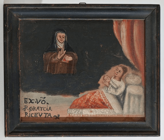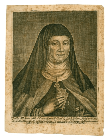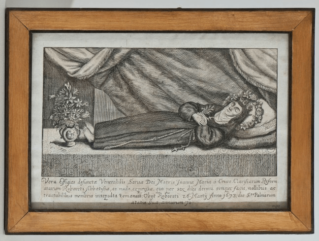 Vera Effigies defuncta Venerabilis Seruae Dei, Matris Joannae Mariae à Cruce, Clarissarum Reform/atarum Roboreti Abbarissae, eo modo expressae, quo per sexc dies decora semper facie, mollibus ac / tractabilibus membris insepulta remansit: Obijt Roboreti . 26. Martij Anno 1673: dei S.to Palmarum / aetatis Suae, annorum 70.