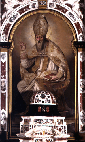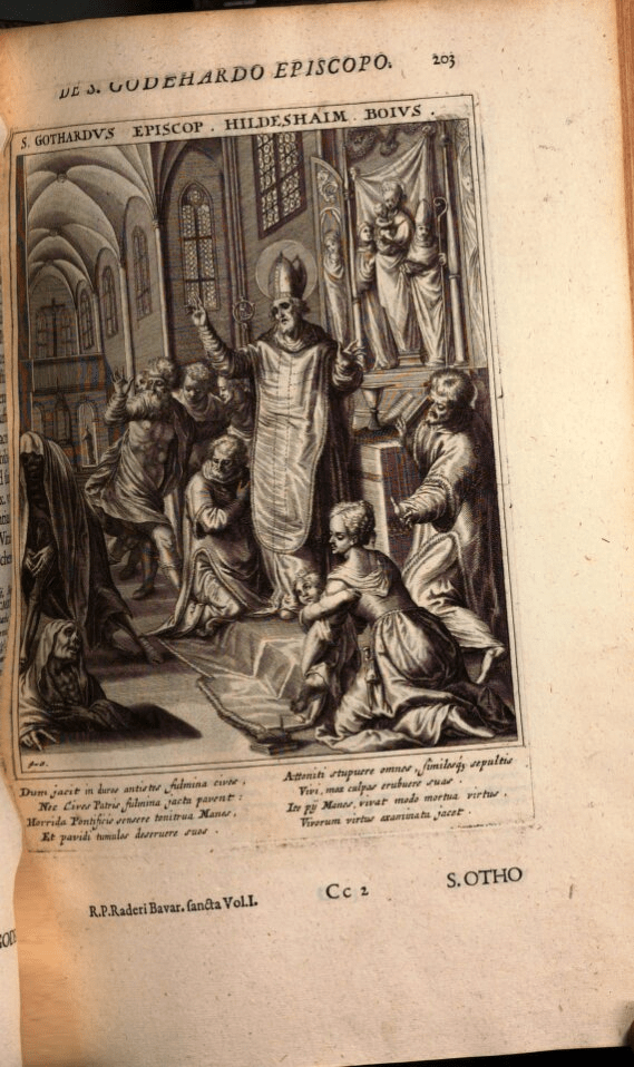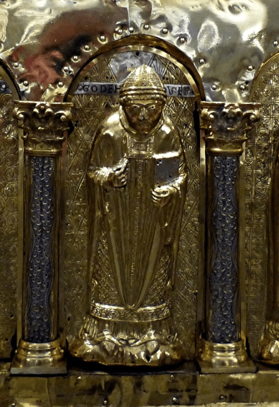Virgin and Child with Saints Epiphanius and Godehard, and donor Dean Wilbrandus of Oldenburg-Wildeshausen on the 13C Baptismal Font in Hildesheim Cathedral (full gallery, another photo, & about)