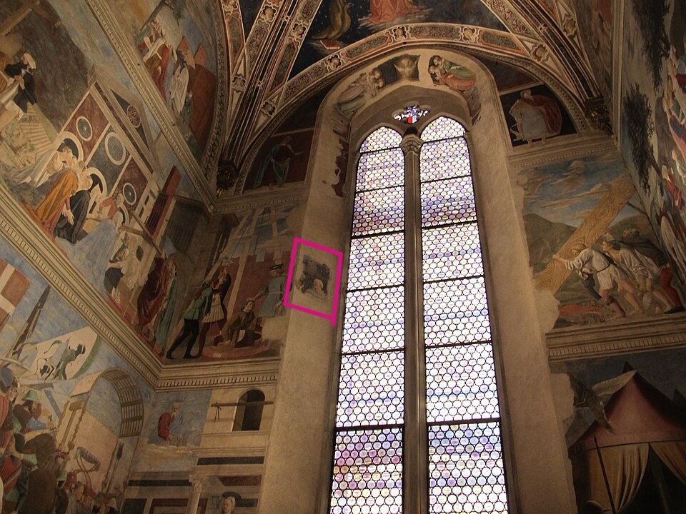 Frescos by Lorentino d’Andrea in San Francesco (Arezzo), also Scuola aretina, san bernardino da siena, xv secolo, con cartiglio del 1587 and fresco in window of center apse by Lorentino d’Arezzo