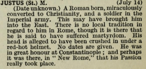 14 July – Saint Justus of Rome Posted bymagistrahildegard14 July 202214 July 2025Posted inSanctoraleTags:Italy, Martyr, Soldier Les Images De Tous Les Saincts et Saintes de L’Année The Book of Saints Modern Hagiography Bibliotheca Sanctorum Roman Martyrology Medieval Hagiography Acta Sanctorum (3 saints by this name on this day, none in Rome) Art & Architecture Index of Medieval Art Share this: Click to share on X (Opens in new window) X Click to share on Facebook (Opens in new window) Facebook Like Loading... Related