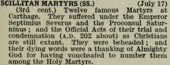 17 July – The Scillitan Martyrs Posted bymagistrahildegard17 July 202217 July 2025Posted inSanctoraleTags:2C, Martyrs, Tunisia Santi Giovanni e Paolo The Book of Saints Modern Hagiography Bibliotheca Sanctorum Martyrologium Romanum Roman Martyrology Sanctorale Catholicum Dictionary of Saintly Women Miniature Lives Of The Saints For Every Day In The Year by Henry Sebastian Bowden. Rome and the Negro: Lives of the Noted African Bishops, Saints, Martyrs, Holy Women and Fathers of Deserts Medieval Hagiography BHL, Supplement Acta Sanctorum The Cult of Saints in Late Antiquity Database The Acts of the Scillitan Martyrs Share this: Click to share on X (Opens in new window) X Click to share on Facebook (Opens in new window) Facebook Like Loading... Related