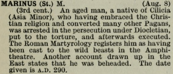 8 August – Saint Marinus of Anazarbus Posted bymagistrahildegard8 August 20228 August 2025Posted inSanctoraleTags:3C, Martyr, Turkey Les Images De Tous Les Saincts et Saintes de L’Année The Book of Saints Modern Hagiography Bibliotheca Sanctorum Martyrologium Romanum Roman Matyrology Lives of the Saints by Sabine Baring-Gould. Medieval Hagiography Acta Sanctorum Art & Architecture Index of Medieval Art Share this: Share on X (Opens in new window) X Share on Facebook (Opens in new window) Facebook Like Loading... Related