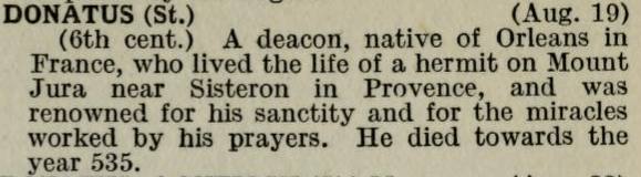 19 August – Saint Donatus of Orléans Posted bymagistrahildegard19 August 202219 August 2025Posted inSanctoraleTags:6C, France, Hermit, Priest Les Images De Tous Les Saincts et Saintes de L’Année The Book of Saints Modern Hagiography Bibliotheca Sanctorum Martyrologium Romanum Roman Martyrology Medieval Hagiography BHL, Supplement Acta Sanctorum Share this: Click to share on X (Opens in new window) X Click to share on Facebook (Opens in new window) Facebook Like Loading... Related