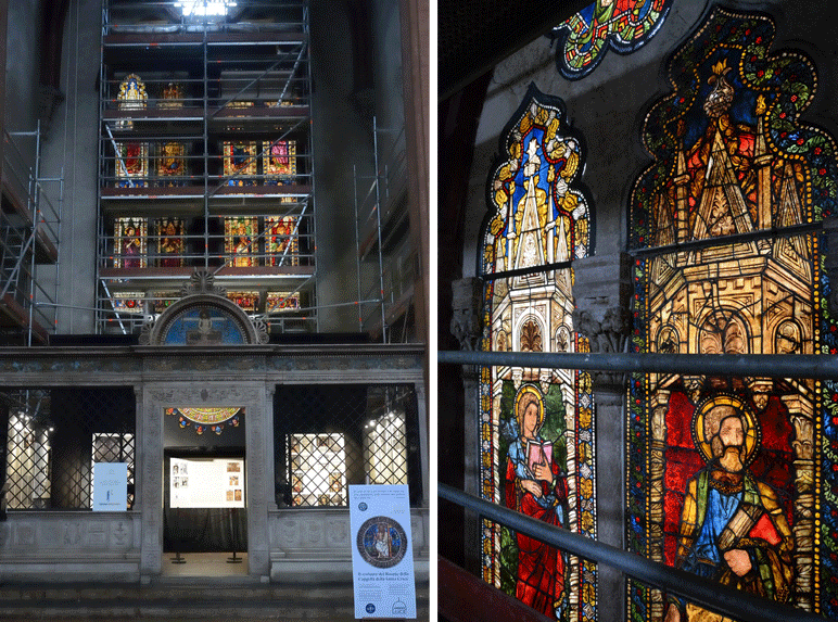 Stained Glass in the Chapel of Santa Croce in San Petronio in Bologna – about its restoration (photos below) ; Instagram Post, also ; about
