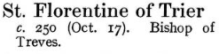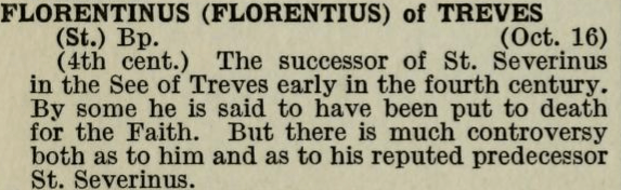 16 October – Saint Florentinus of Trier Posted bymagistrahildegard16 October 202216 October 2025Posted inSanctoraleTags:4C, Bishop, Germany Les Images De Tous Les Saincts et Saintes de L’Année The Book of Saints Modern Hagiography Bibliotheca Sanctorum Roman Martyrology Medieval Hagiography BHL Acta Sanctorum Art & Architecture Index of Medieval Art Saints and their Emblems Share this: Click to share on X (Opens in new window) X Click to share on Facebook (Opens in new window) Facebook Like Loading... Related
