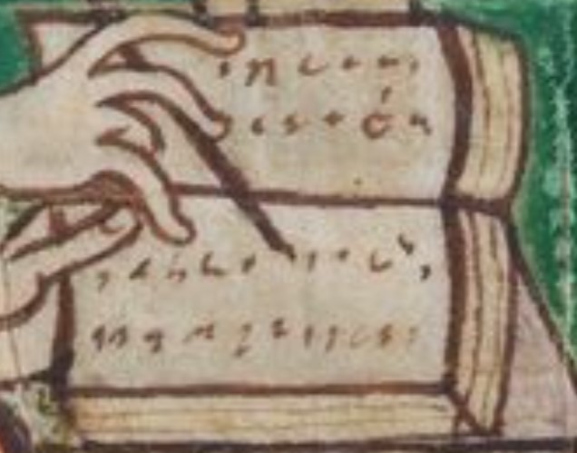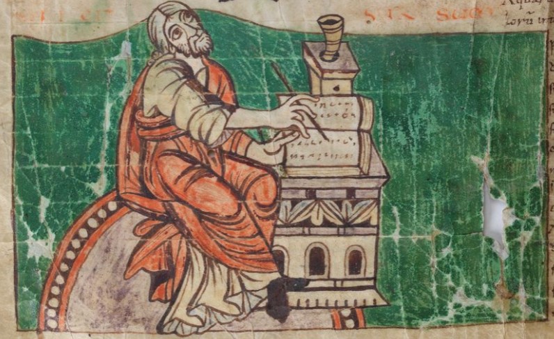 What: architectonic desk, acanthus leaves, codex, stylus, ink horn, ink stand, toga, tunic, slippers