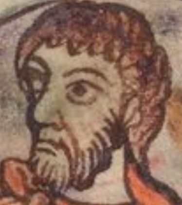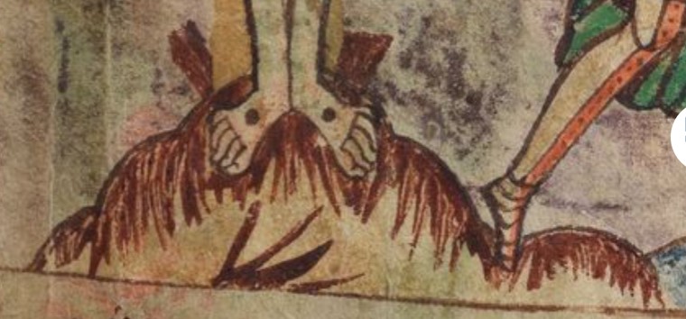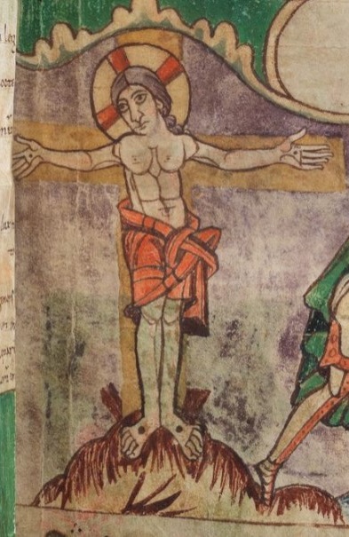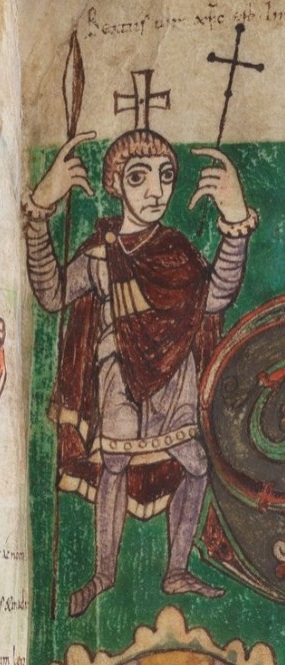 What: B, spear, cross-staff, tunic, mantle, leggings, cross on head