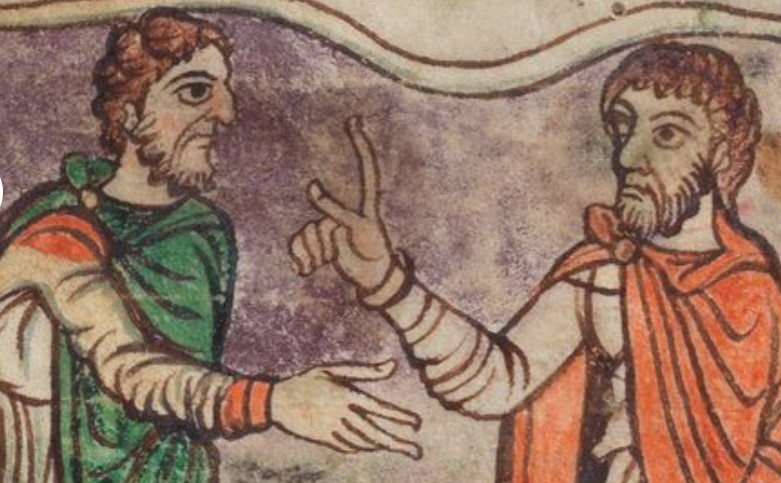 Who: Crucifixion; Lunging and Listening/Receiving Male Figure approaching Seated and Speaking/Instructing Male Figure.