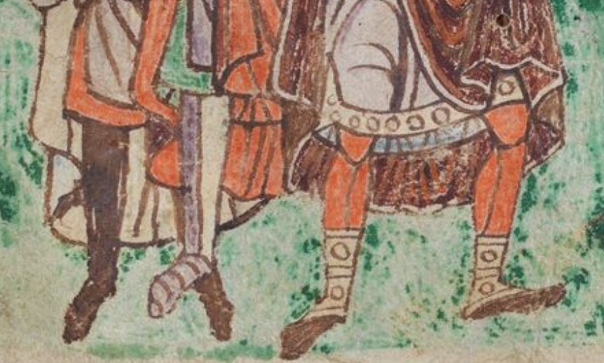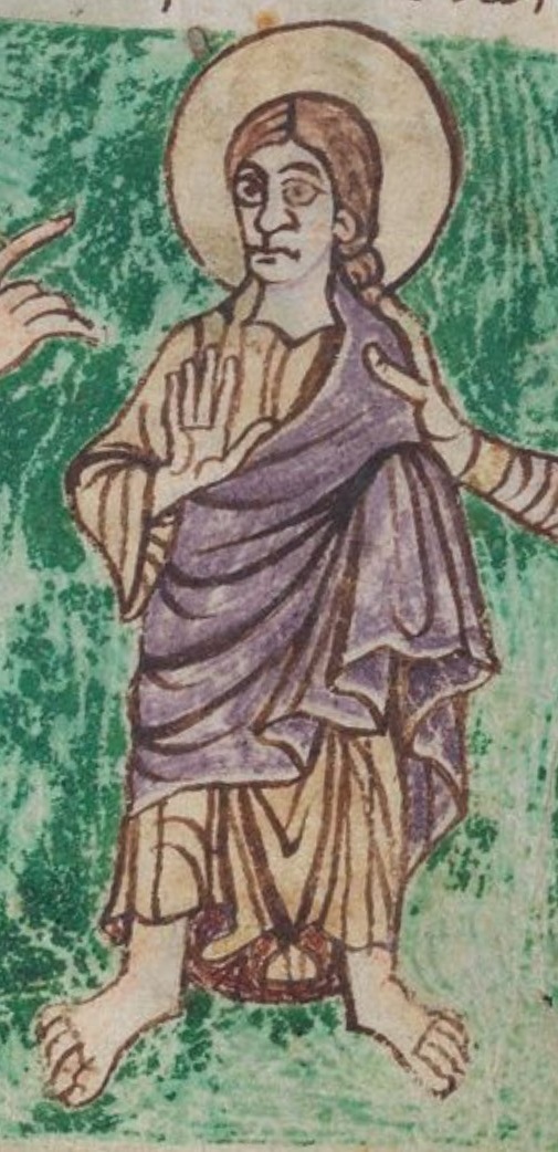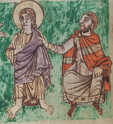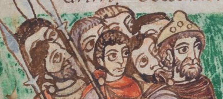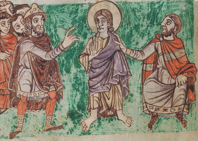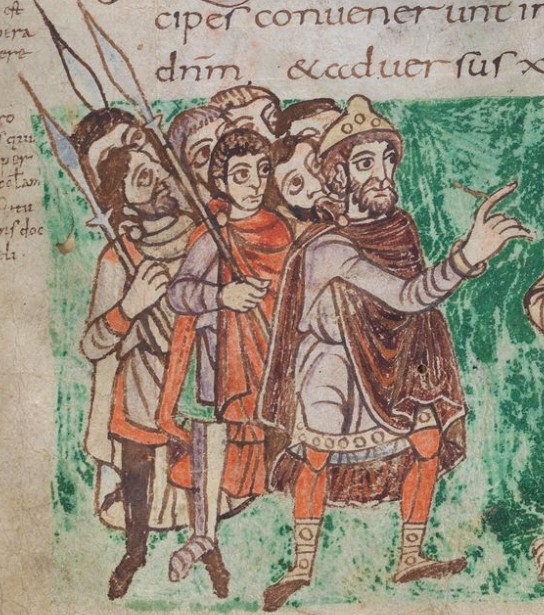 Who: King accompanied by seven men, three of whom carry spears, and speaking to Christ who is listening/receiving and is presented by seated male figure (possibly same seated figure as on other side of folio, illustrating Psalm 1.2, though with broad horizontal band across mantle).