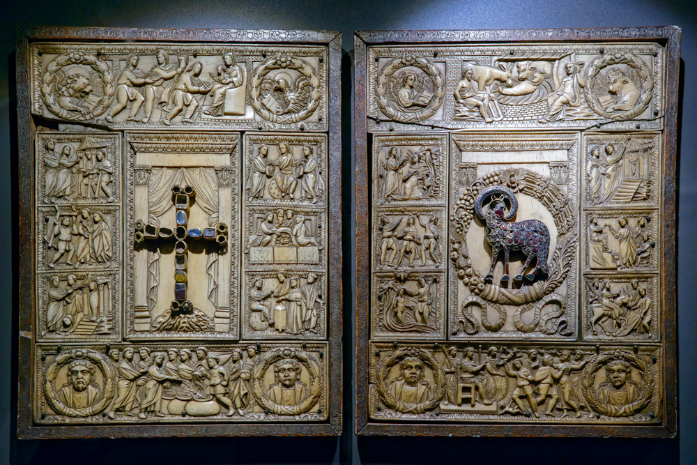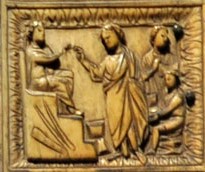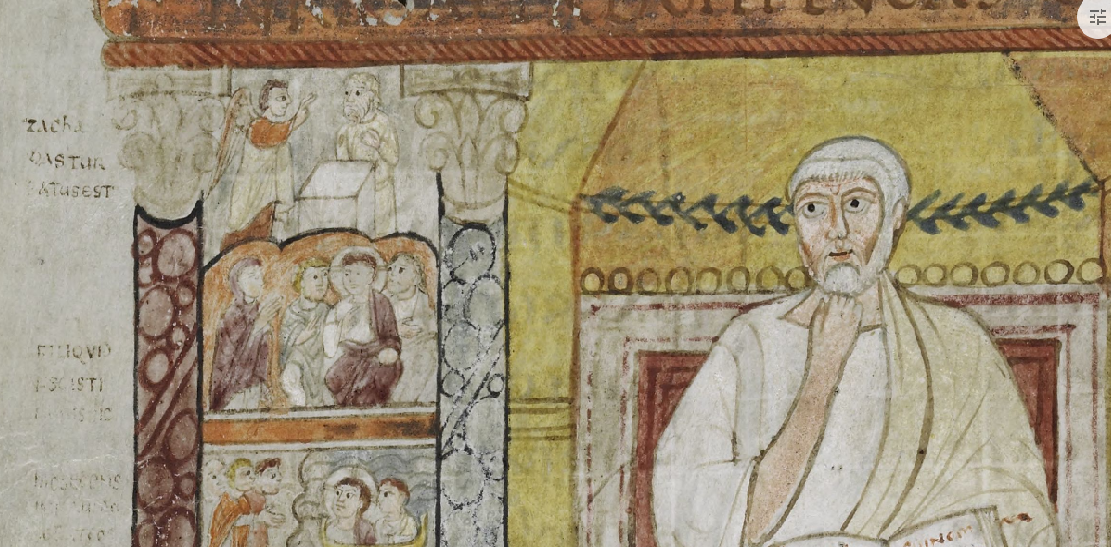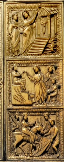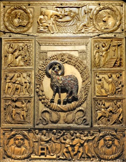 Today’s Gospel is about Christ teaching in the Temple, traditionally called Christ among the Doctors by art historians. One of several scenes on a fifth-century ivory diptych in Milan Cathedral and in a manuscript sent from Rome to England in the 7th century (see also), itself clearly modeled on a model like the Milan ivory.