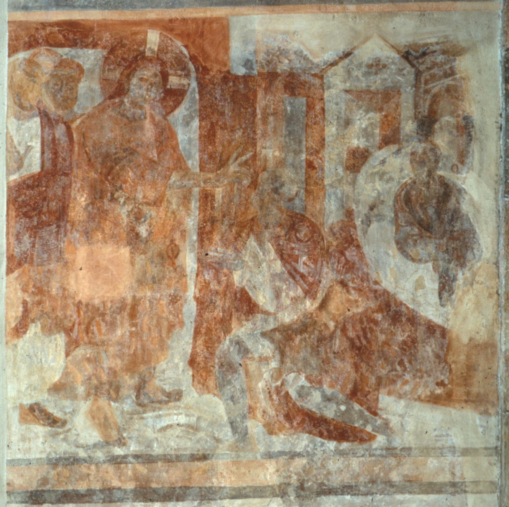 This Sunday’s Gospel tells the story of two healings, that of the leper and that of the Centurion’s servant. Stories of Christ healing figure prominently in early Christian and early Medieval art and less prominently into the early modern era; nevertheless, the Healing of the Leper and The Healing of the Centurion’s Servant are relatively rare. Here is a Carolingian-era fresco in which Christ accompanied by three apostles stands framed within an arch and blesses/speaks to the Centurion who kneels before him. The paralyzed servant sits above to the right on a tilted mandorla.