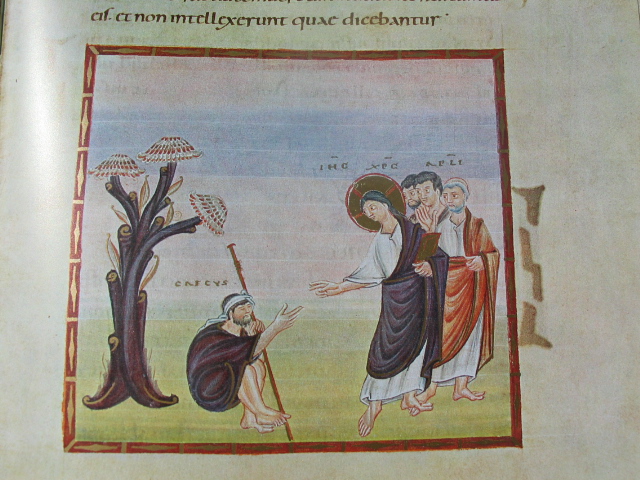 This week the Gospel begins with Jesus prophesying his Passion, but continues with the healing of the blind man as Jesus comes to Jericho. The Gospels recount several healings from blindness – the man born blind in John 9, whom Jesus heals with clay and instructs to wash in the pool at Siloe; two blind men in Galilee in Matthew 9; the healing of the blind man in Bethsaida in Mark 8; and the healing of the blind man as Jesus leaves Jericho in Mark 10, who is named Bartimeus. Understandably, distinguishing representations of the various Gospel healings from another can be tricky and may depend not on visual clues, such as a the water for the man born blind or the pair of blind men in Matthew. In the image above, from the Ottonian manuscript, the Codex Egberti, you can read the text that precedes the story in the Gospel of Luke.