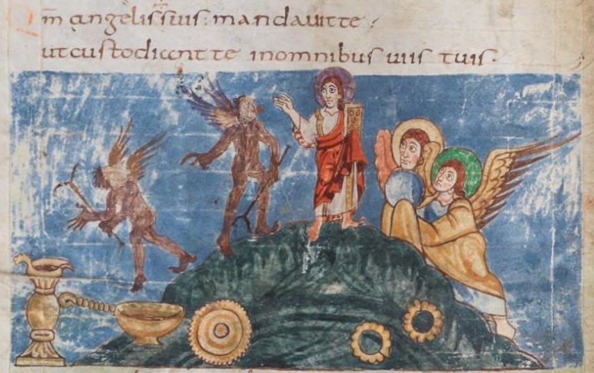 In today’s Gospel reading, we read about the Temptation of Christ. A rather dramatic story that nevertheless did not receive visual representation until well into the Middle Ages. Among the earliest, this illumination from the Stuttgart Psalter (folio 107v) illustrates Psalm 90, coming between verses 11 and 12.