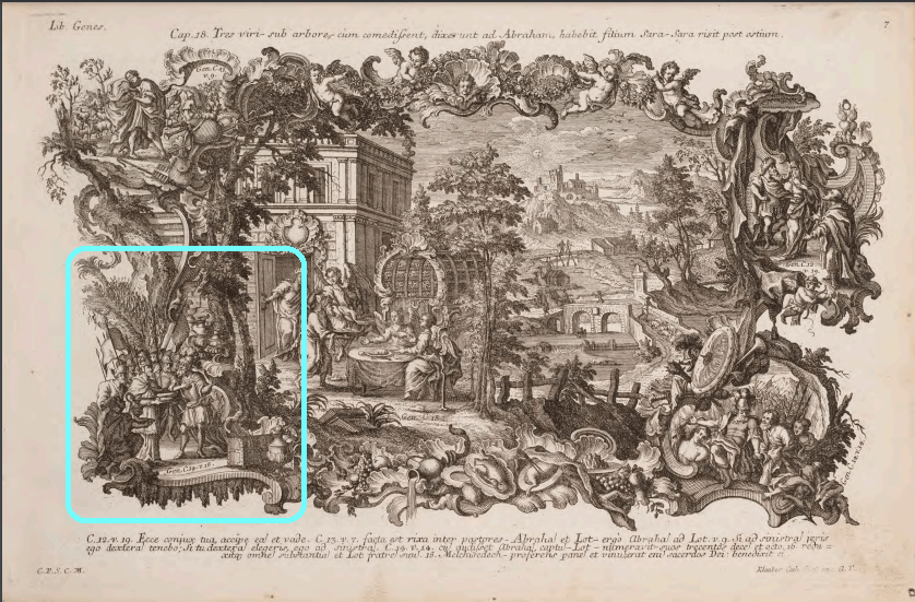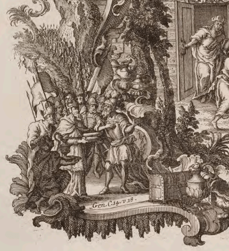 C.12 V.19 ecce conjux tua, accipe eam, et vade. C.13 V.7 facta est rixa inter pastores – Abram et Lot. Eo autem tempore Chananaeus et Pherezaeus habitabant in terra illa. [V.8] ergo Abram ad Lot. V.9 Si ad sinistram ieris, ego dexteram tenebo : si tu dexteram elegeris, ego ad sinistram. C.14 V.14 cum audisset Abram, captum – Lot – numeravit – suos trecentos decem et octo. C.14 V.16 Reduxitque omnem substantiam, et Lot fratrem suum. C.14 V.18 Melchisedech proferens panem et vinum; erat enim sacerdos Dei: benedixit ei.