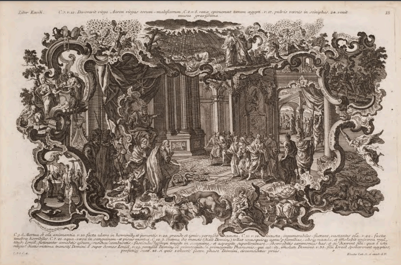 Above C.7 V.12 Devoravit virga Aaron virgas eorum – maleficorum. C.8 V.6 ranae operuerunt terram aegypti. V.17 pulvis versus in sciniphes. V. 24 venit musca gravissima.