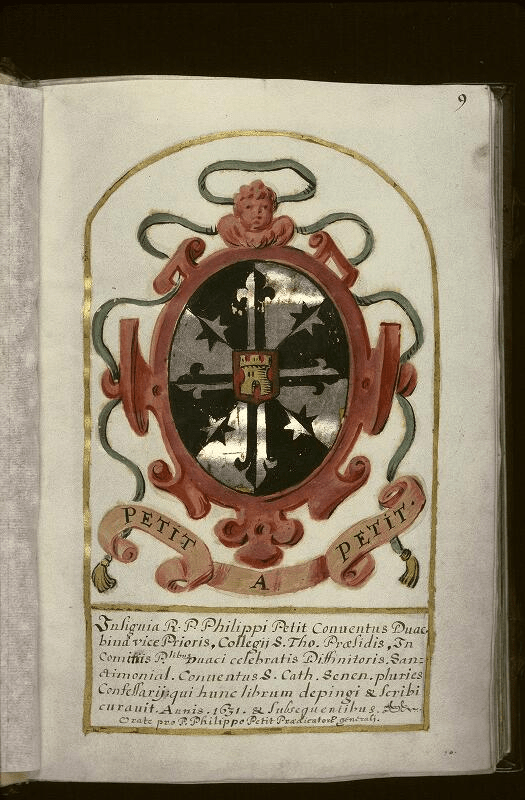Insignia R. P. Philippi Petit Conventus Douai. binam vice Prioris, Collegii S. Tho. Praesidis, In Comitiis P.libus Douai celebratis Diffinitoris. Sanctimonial. Conventus S. Cath. Senen. pluries Confessarii: qui hunc librim dipingi & scribi curavit. Annis. 1631 & subsequentibus. Orate pro P. Philippo Petit Praedicatoris generali.