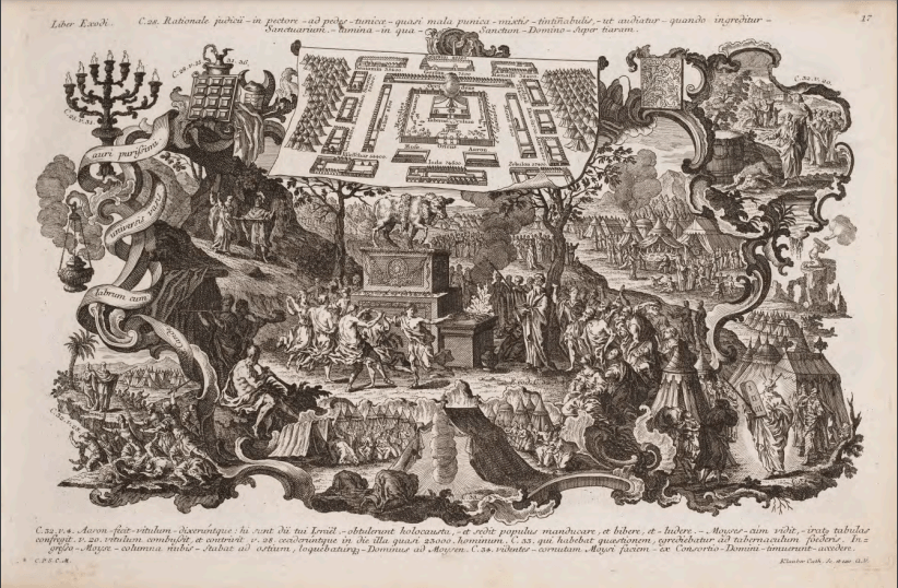 Below C.32 V.4 Aaron – fecit – vitulum – dixeruntque: hi sunt dii tui Israel. – obtulerunt holocausta, – et sedit populus manducare, et bibere, et – ludere. – Moyses – cum vidit, – iratus tabulas confregit. V.20 vitulum combussit, et contribit. V.28 cecideruntque in die illa quasi 23000 hominum. C.33. qui habebat quaestionem, egrediebatur ad tabernaculum foederis. Ingresso – Moyse – columna nubis – stabat ad ostium, loquebaturque – Dominus ad Moysen. C.34 videntes – cornutam Moysi faciem – ex Consortio – Domini – timuerunt – accedere.