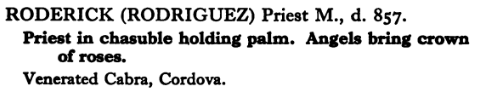 13 March – Saint Roderick Posted bymagistrahildegard13 March 202413 March 2025Posted inSanctoraleTags:9C, Priest, Spain Heiliger Rodrigo by Bartolomé Esteban Murillo (1650/55) SAN RODRIGO, MARTYR [Material gráfico] : A 13 de Marzo The Book of Saints Modern Hagiography Roman Martyrology Lives of the Saints by Sabine Baring-Gould. Medieval Hagiography BHL Acta Sanctorum Art & Architecture Saints and their Attributes Share this: Click to share on X (Opens in new window) X Click to share on Facebook (Opens in new window) Facebook Like Loading... Related