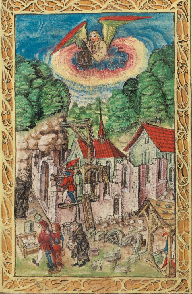Bau der Klosterkirche im Hof unter der Leitung des Abtes Wichard