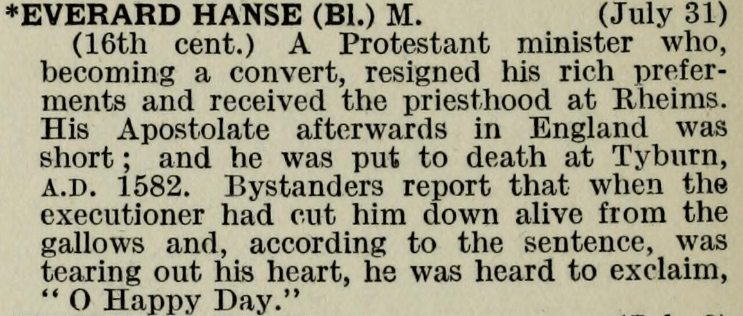 31 July – Blessed Everard Hanse Posted bymagistrahildegard31 July 20242 December 2025Posted inSanctoraleTags:16C, England, Martyr Ecclesiæ anglicanæ trophæa The Book of Saints Modern Hagiography Bibliotheca Sanctorum Martyrologium Romanum A Menology of England and Wales Writings Memoirs of Missionary Priests Share this: Click to share on X (Opens in new window) X Click to share on Facebook (Opens in new window) Facebook Like Loading... Related