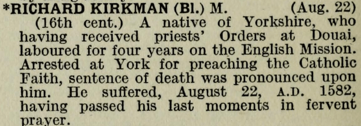 22 August – Blessed Richard Kirkman Posted bymagistrahildegard22 August 20244 December 2025Posted inSanctoraleTags:16C, England, Martyr Ecclesiæ anglicanæ trophæa The Book of Saints Modern Hagiography Bibliotheca Sanctorum Martyrologium Romanum A Menology of England and Wales Lives of the English Martyrs Declared Blessed by Pope Leo XIII, in 1886 and 1895 Memoirs of Missionary Priests Share this: Click to share on X (Opens in new window) X Click to share on Facebook (Opens in new window) Facebook Like Loading... Related