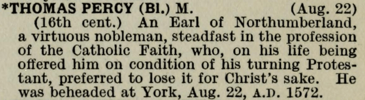 22 August – Blessed Thomas Percy Posted bymagistrahildegard22 August 202422 August 2025Posted inSanctoraleTags:16C, England, Martyr Image Source The Book of Saints Modern Hagiography Bibliotheca Sanctorum Martyrologium Romanum A Book of English Martyrs Lives of the English Martyrs Declared Blessed by Pope Leo XIII, in 1886 and 1895 Mementoes of the English Martyrs and Confessors for Every Day in the Year, also, and also, and also Share this: Click to share on X (Opens in new window) X Click to share on Facebook (Opens in new window) Facebook Like Loading... Related