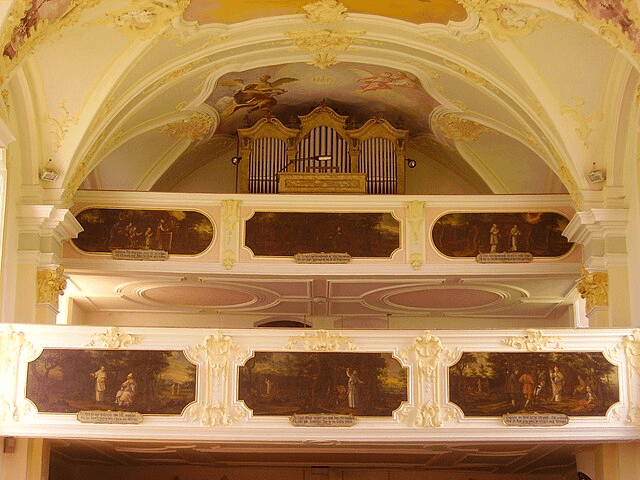 Wallfahrtskirche Wilparting – Wikipedia ; Wikimedia Commons ; Series of scenes from life of saints – scene 1 , scene 2 , scene 3 ; Scenes along nave wall – scene 1 , scene 2 , scene 3 , scene 4 , scene 5 , scene 6