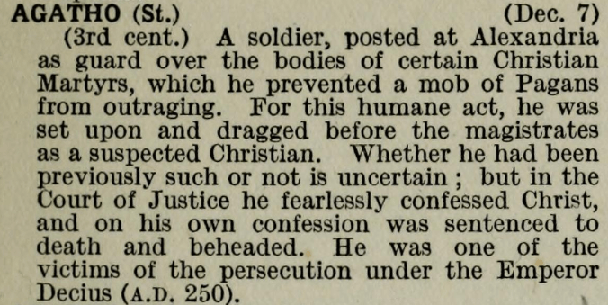 7 December – Saint Agatho Posted bymagistrahildegard7 December 20247 December 2025Posted inSanctoraleTags:3C, Egypt, Soldier Les Images De Tous Les Saincts et Saintes de L’Année The Book of Saints Modern Hagiography Bibliotheca Sanctorum Roman Martyrology Share this: Click to share on X (Opens in new window) X Click to share on Facebook (Opens in new window) Facebook Like Loading... Related