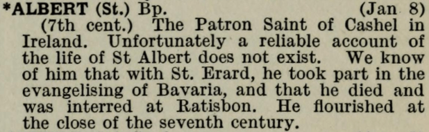 8 January – Saint Albert of Cashel Posted bymagistrahildegard8 January 20258 January 2026Posted inSanctoraleTags:7C, Germany, Missionary 09 St Albert of Cashel detail, Harry Clarke, Honan Chapel Stained Glass Bavaria Sancta, Augsburg, Staats- und Stadtbibliothek — 2 Th L 65 The Book of Saints Modern Hagiography Bibliotheca Sanctorum Martyrologium Romanum Lives of the Irish Saints by John O’Hanlon. Medieval Hagiography BHL Acta Sanctorum Art & Architecture Wikimedia Commons Share this: Click to share on X (Opens in new window) X Click to share on Facebook (Opens in new window) Facebook Like Loading... Related