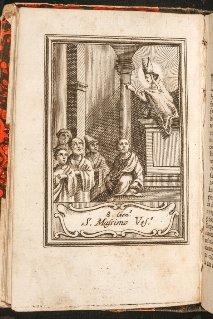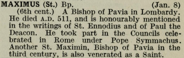 8 January – Saint Maximus of Pavia Posted bymagistrahildegard8 January 20258 January 2026Posted inSanctoraleTags:6C, Bishop, Italy Libro del Compendio della vita dei santi The Book of Saints Modern Hagiography Bibliotheca Sanctorum Martyrologium Romanum Roman Martyrology Medieval Religion Listserv Medieval Hagiography Acta Sanctorum Share this: Share on X (Opens in new window) X Share on Facebook (Opens in new window) Facebook Like Loading... Related