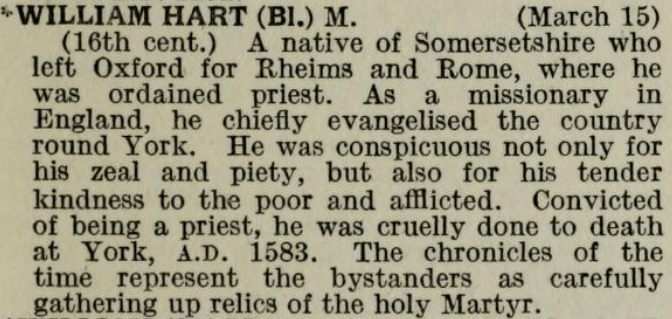 15 March – Blessed William Hart Posted bymagistrahildegard15 March 20254 December 2025Posted inSanctoraleTags:16C, England, Martyr, Priest Ecclesiæ anglicanæ trophæa The Book of Saints Modern Hagiography A Menology of England and Wales Memoirs of Missionary Priests Share this: Click to share on X (Opens in new window) X Click to share on Facebook (Opens in new window) Facebook Like Loading... Related