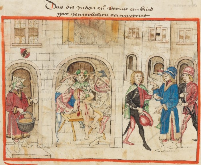 17 April – Saint Rudolf of Bern Posted bymagistrahildegard17 April 202525 March 2025Posted inSanctoraleTags:13C, Martyr, Switzerland Frauenfeld, Kantonsbibliothek Thurgau / Y 111 Ritualmord in Bern, 1294. Die Juden ermorden den Knaben Ruef, der als Märtyrer im Heiligen-Kreuz-Altar begraben wird. Die Juden werden aus der Stadt vertrieben. Zu beachten die hübsche Darstellung der Lauben und die Judenhüte. Modern Hagiography German Wikipedia Medieval Hagiography Acta Sanctorum Share this: Click to share on X (Opens in new window) X Click to share on Facebook (Opens in new window) Facebook Like Loading... Related