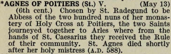 13 May – Saint Agnes of Poitiers Posted bymagistrahildegard13 May 202513 May 2025Posted inSanctoraleTags:6C, Abbess, France Stained Glass in Sainte Radegonde de Poitiers The Book of Saints Modern Hagiography Dictionary of Saintly Women La vie des saints Medieval Hagiography Acta Sanctorum Art & Architecture Index of Medieval Art Wikimedia Commons Share this: Click to share on X (Opens in new window) X Click to share on Facebook (Opens in new window) Facebook Like Loading... Related