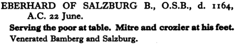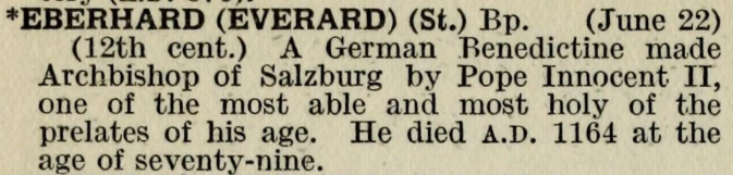 22 June – Saint Eberhard of Salzburg Posted bymagistrahildegard22 June 202522 June 2025Posted inSanctoraleTags:12C, Austria, Bishop Erzbischof Eberhard I., Salzburg Erzbischof Eberhard I., Salzburg Erzbischöfe von Salzburg: Eberhard I. (1147–1164) Sankt Paulus/Dom in Münster Bavaria Sancta, Augsburg, Staats- und Stadtbibliothek — 2 Th L 65 The Book of Saints Bibliotheca Sanctorum Medieval Hagiography BHL, Supplementum Acta Sanctorum Art & Architecture Index of Medieval Art Europeana Wikimedia Commons Saints and their Attributes Share this: Click to share on X (Opens in new window) X Click to share on Facebook (Opens in new window) Facebook Like Loading... Related