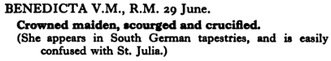29 June – Saint Benedicta of Sens Posted bymagistrahildegard29 June 202529 June 2025Posted inSanctoraleTags:3C, France, Martyr, Virgin The Book of Saints Bibliotheca Sanctorum Roman Martyrology Dictionary of Saintly Women Medieval Hagiography Acta Sanctorum Art & Architecture Saints and their Attributes (more likely Saint Benedicta/Benoîte d’Origny, 8 October) Share this: Click to share on X (Opens in new window) X Click to share on Facebook (Opens in new window) Facebook Like Loading... Related