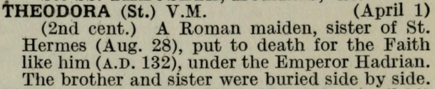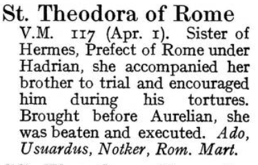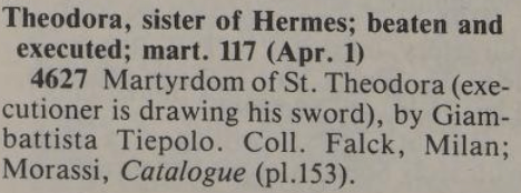 1 April – Saint Theodora Posted bymagistrahildegard1 April 202631 March 2026Posted inSanctoraleTags:2C, Martyr, Rome, Virgin Sainte Théodora de Rome recueillant le corps de saint Hermès (France, Paris. Bibliothèque nationale de France, Département des manuscrits, Français 309 f.84) Martirio di Santa Teodora di Roma (Martyrdom of Saint Theodora of Rome), by Giambattista Tiepolo. Sala del Parlatorio, Ca’ Rezzonico, Venice Pils (peintre) – tableau : Translation des reliques de sainte Théodora devant l’église de Montfort-le-Rotrou (?Maybe this Theodora?) The Book of Saints Modern Hagiography Roman Martyrology Lives of the Saints by Sabine Baring-Gould. La vie des saints Medieval Hagiography Acta Sanctorum Art & Architecture Index of Medieval Art Portail Biblissima Vatican Colonnade Post-Biblical Saints Art Index Saints and their Emblems Share this: Share on X (Opens in new window) X Share on Facebook (Opens in new window) Facebook Like Loading... Related