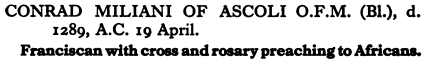 19 April – Saint Conrad of Ascoli Posted bymagistrahildegard19 April 202623 February 2026Posted inSanctoraleTags:13C, Franciscan, Italy Beato Corrado Miliani (dipinto) di Monti Nicola Antonio (sec. XVIII) Medieval Hagiography Acta Sanctorum Art & Architecture Wikimedia Commons Altar Frontal Saints and their Attributes Share this: Share on X (Opens in new window) X Share on Facebook (Opens in new window) Facebook Like Loading... Related