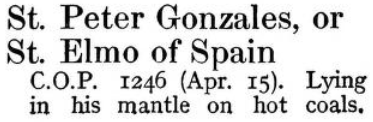 This image commonly attached to Saint Peter González is not him. This Dominican Saint in the Quaranta domenicani illustri, ex convento di San Niccolò, Sala del Capitolo, Treviso, 1352 (website of Seminary), is identified as Saint Peter only on the basis of the caption; rather, he is Frate Pietro Sendre, according to the Catalogo generale dei beni culturali
