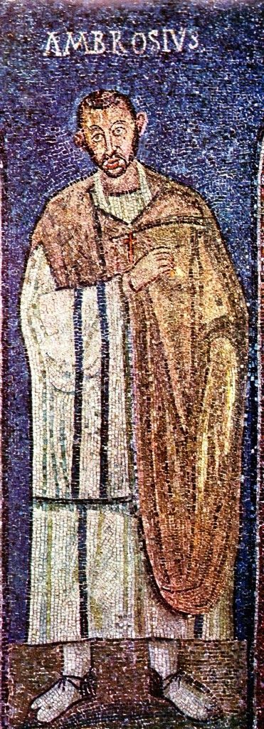 The earliest image is in a side chapel dedicated to Saint Vincent, called the Chapel of San Vittore in Ciel d’oro. Ambrose died in 397, and the mosaics in this chapel date to fifth century. It is not a contemporary portrait, but in the grand scheme of the Middle Ages, it seems very nearly.