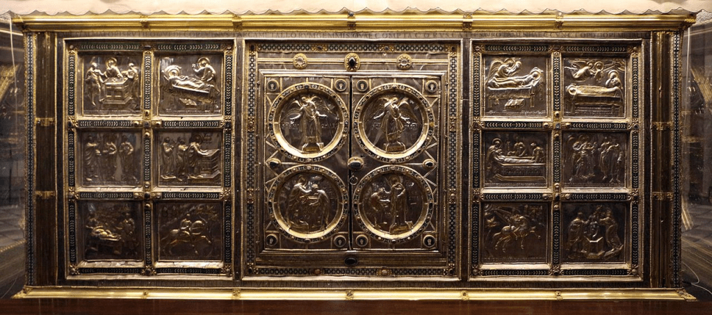 From the ninth century, the Golden Altar in Sant’Ambrogio presents a cycle of Christ’s life in gold on the front and a cycle of Saint Ambrose’s life in silver on the back. The most accessible information comes from the entry about it on the Italian Wikipedia website. Within Chrome, right click on any blank area in the page, and select “Translate to English.” The teacher or older students interested in art history may read more here.